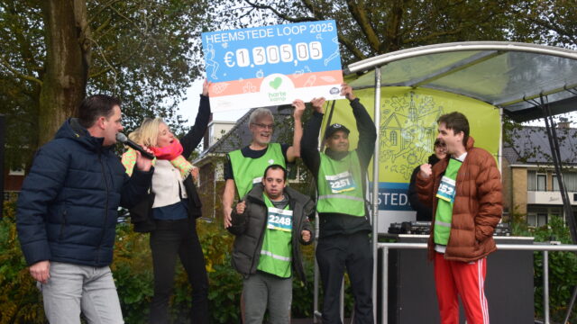 Om half negen nog nauwelijks lopers bij de start, want die schuilden bij HBC-tennis met een warme koffie en het startbewijs. Voor de start om negen uur nog de uitreiking van een mooie cheque aan de Hartekampgroep, het goede doel van de Heemstede Loop. Met dank werd een bedrag van 1305,05 euro aanvaard, dat besteed gaat worden aan sport binnen de groep.