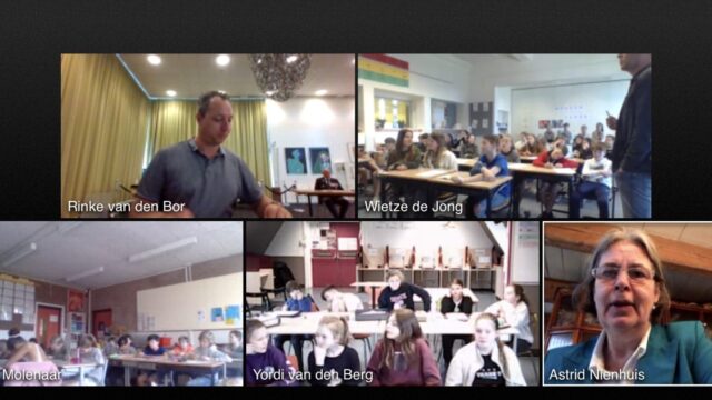 Foto: De livestream tussen de scholen en burgemeester Astrid Nienhuis (Aangeleverd).