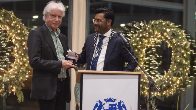 Heemstede – Maandagavond 5 januari, tijdens de nieuwjaarsreceptie van de gemeente Heemstede, heeft burgemeester Falgun Binnendijk een gouden erepenning uitgereikt aan de 81-jarige zanger, componist en tekstschrijver Boudewijn de Groot. Deze prestigieuze onderscheiding die volgens de gemeente zelden wordt toegekend, is bestemd voor inwoners die zich in uitzonderlijke mate verdienstelijk hebben gemaakt voor Heemstede. De onderscheiding wordt toegekend door het college van burgemeester en wethouders en wordt volgens de gemeente zelden verleend.