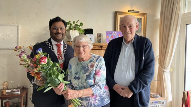 Heemstede – Onlangs wist burgemeester Falgun Binnendijk het echtpaar Prins te verrassen met een bezoek, dat 60 jaar getrouwd is. Hij had de huwelijksakte meegebracht, die 60 jaar geleden hier in Heemstede gesloten is. Meneer en mevrouw Prins zijn gezegend met vier kinderen, zes kleinkinderen en een achterkleinkind.
