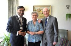 Foto: Burgemeester Astrid Nienhuis te midden van het echtpaar Potma. Foto aangeleverd.