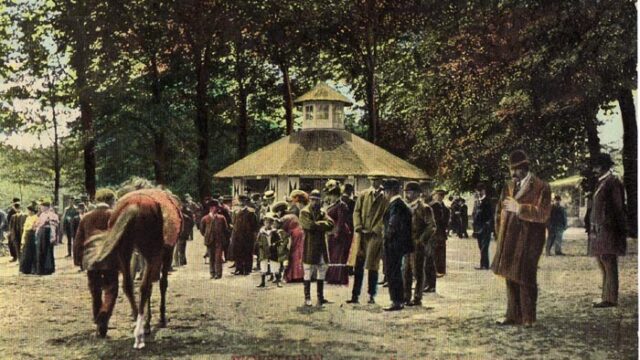 Beeld: Oude prent met ‘gokhuisje’ op paardenrenbaan op Woestduin, ca 1900. Beeld aangeleverd door LNH.