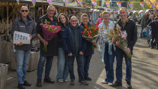 “Ze staan er altijd, in weer en wind, storm en regen”, sprak de wethouder vol waardering. De drie marktondernemers Jaap Bos, Marlies Drogtrop en Edwin de Groot, die al 40 jaar op de markt staan, werden nog eens éxtra door de wethouder in het zonnetje gezet met een grote bos bloemen.