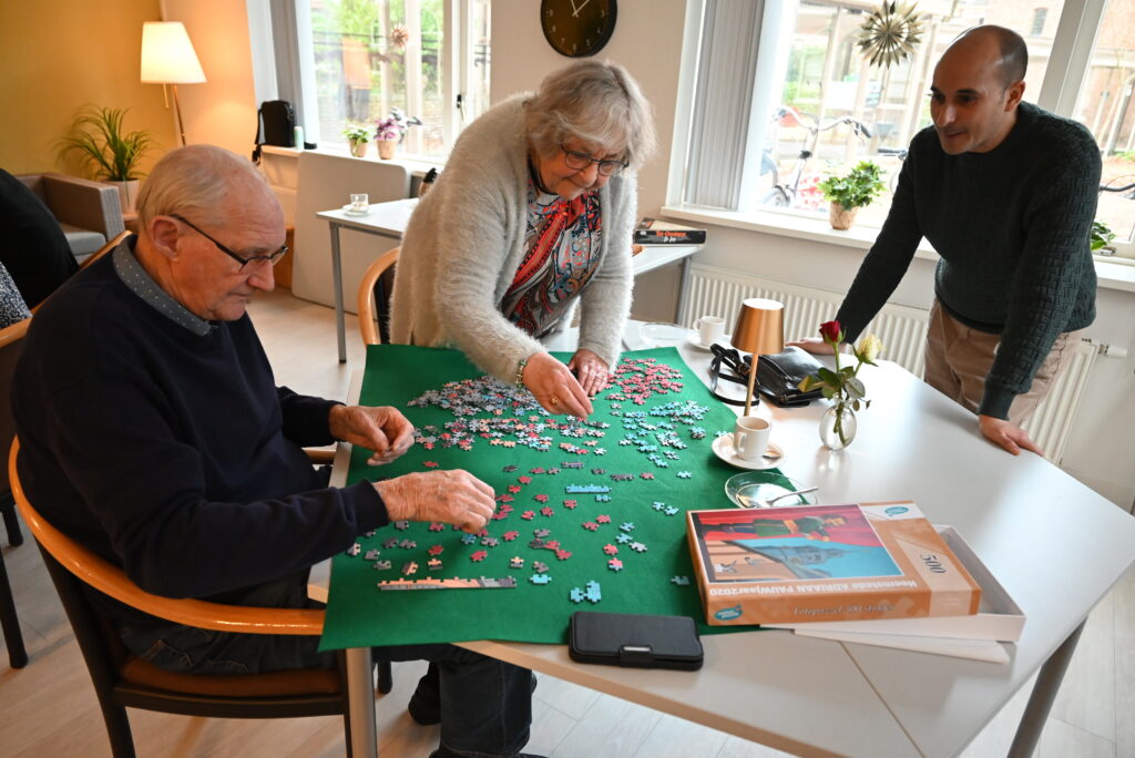 Het verschil met de Sociëteit op Plein1 van Katinka Verdonk is, is dat de Pauwehof een vrije inloop heeft: iedereen is welkom”, leggen sociaal werkers Anky en Muriel uit. “We willen het echt laagdrempelig houden.” Inmiddels loopt de Pauwehof langzaam vol en gonst het van de gezellige gesprekken. Er wordt gebabbeld, koffie of thee gedronken, er worden spelletjes gespeeld en er wordt gepuzzeld. De meegebrachte panettone gaat er bij de bezoekers gretig in.