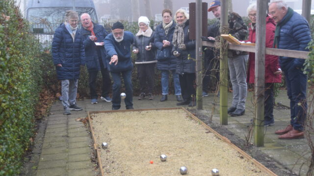 Door de koffie, de heerlijkheden en het gezellige kletsen, zou er haast vergeten worden dat er deze dag een spel te doen is. Het is redelijk fris buiten, maar er werden even wat spelrondes Jeu de Boules gespeeld. De één met ervaring. Ben is daar één van en die houdt nauwlettend het scoreverloop bij. De ander speelde het altijd op vakantie in Frankrijk. Hoewel het een kort Jeu de Boules-baantje is bij Plein1, is het groot genoeg voor de wat gevorderde leeftijd. Dan wordt er gesproken van tussen de 55 en 70 jaar. Er wordt zichtbaar genoten van het spel. Het kan maandelijks gespeeld worden, er is een appgroep van spelers. Dat alleen al zorgt voor verbinding.