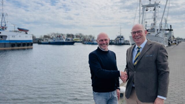 KIMO/VNKG en de Nederlandse Visserbond slaan handen ineen, links Arend-Jan van der Vlugt, directeur KIMO/VNKG en rechts Johan Nooitgedagt, voorzitter Nederlandse Vissersbond. (Foto aangeleverd).