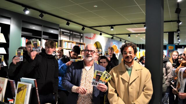 Heemstede – Donderdagmiddag 16 maart was een bijzondere dag in de Boekenweek bij Boekhandel Blokker aan de Binnenweg 138 in Heemstede. Naast Raoul de Jong, de auteur van het boekenweekessay ‘Boto Banja’, waren zo’n 60 enthousiaste leerlingen van het HBM (Haemstede Barger Mavo) te gast in de boekhandel, een volle bak dus. Samen met eigenaar Arno Koek, deelde Raoul 60 exemplaren van zijn boekenweekessay uit aan deze leerlingen, die speciaal voor hem naar de boekhandel waren gesneld. Na het uitreiken van de boeken, werd Raoul de Jong kort in de winkel geïnterviewd en kon het aanwezige publiek zijn werk laten signeren.