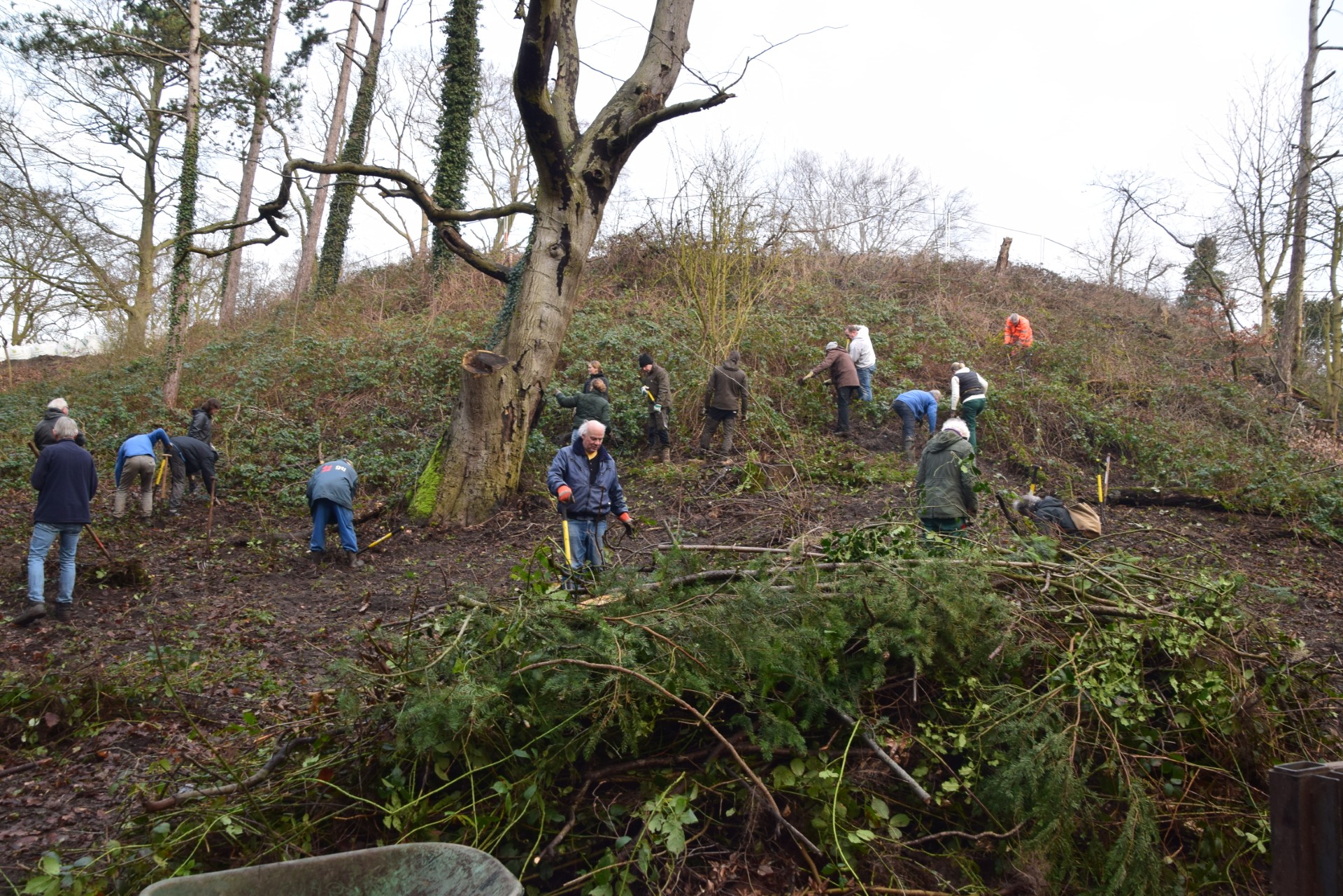 Heemstede – Vrijdag 23 januari is er een grote groep om half tien begonnen aan de heuvel rondom de Belvedère. Bovenop de heuvel ligt al de bekisting voor het fundament van de nieuwe toren. Onderaan de heuvel wordt ook een ‘fundament’ aangelegd, maar dan aan nieuwe aanplant. De groep vrijwilligers, die normaal onderhoud doet bij Park Meermond, had nu als extra ‘uitje’ de Belvedère heuvel onderhouden en voorzien van nieuwe aanplant. Samen met boswachters Kees en Rogier en wat extra mensen van de organisatie MeerBomen Nu werd de heuvel flink aangepakt.