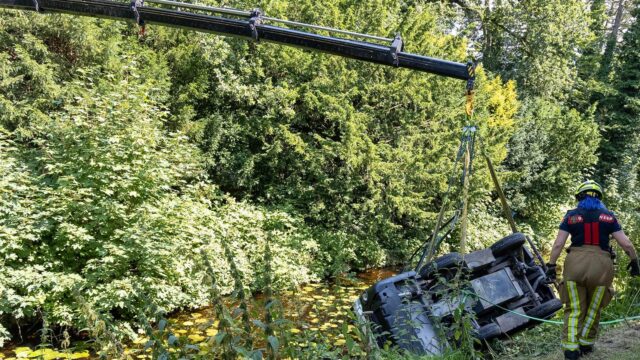 Hoe dat kon gebeuren is onbekend. De twee inzittenden zijn door een ambulance overgebracht naar het ziekenhuis. De brandweer kwam ter plaatse om het vervoersmiddel te borgen zodat het niet in het water zou belanden. Met behulp van een kraan heeft de brandweer het wagentje weer op de wielen gezet.