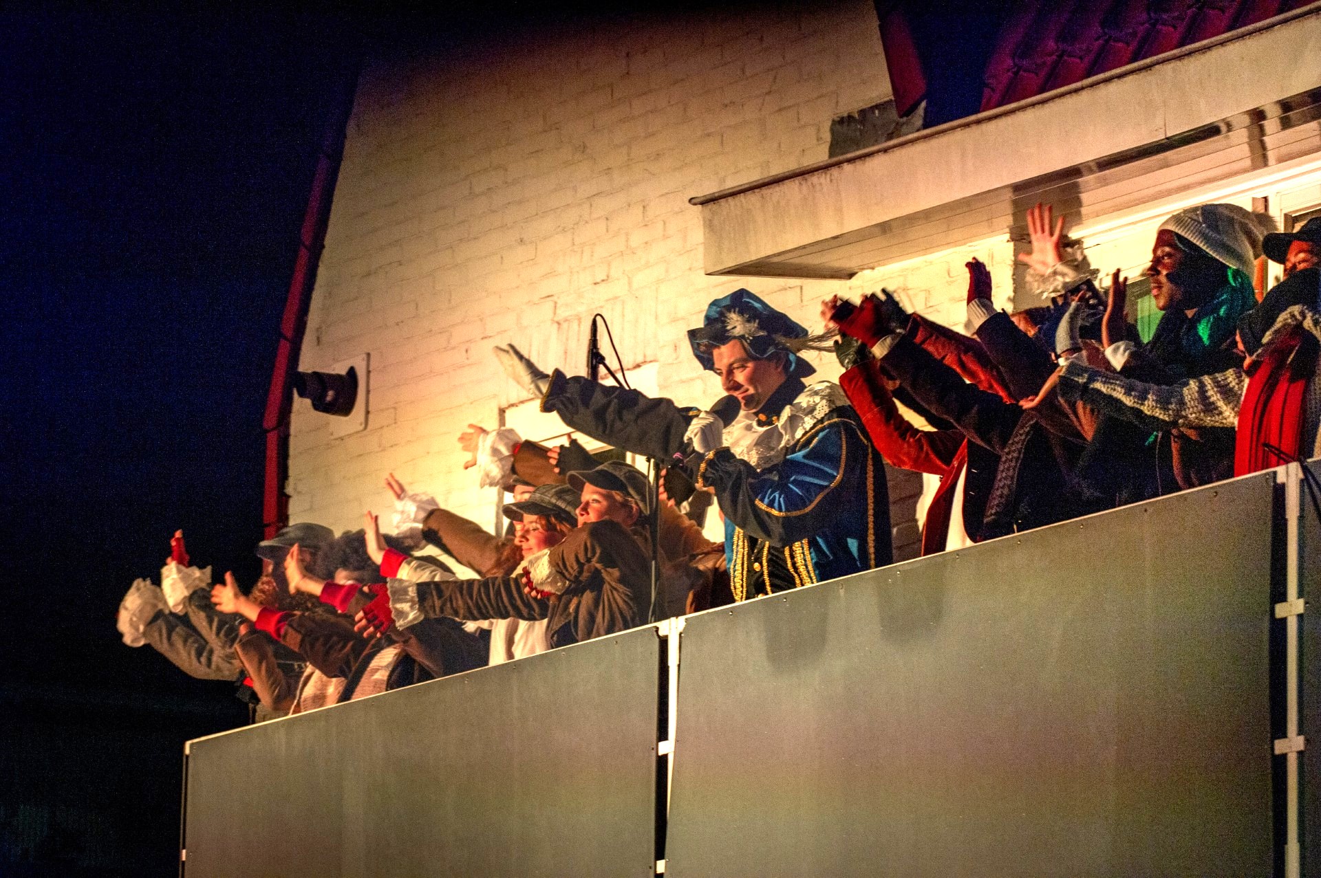 Foto boven: Sinterklaas en zijn pieten begroeten de menigte vanaf het dak in de Jan van Goyenstraat
