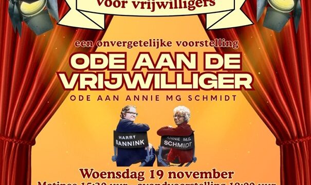 Daarom worden Heemsteedse vrijwilligers uitgenodigd voor de theatervoorstelling: ‘Ode aan de Vrijwilliger’ op woensdag 19 november in de Luifel aan de Herenweg 96 in Heemstede. Omdat vrijwilligers het verschil in Heemstede maken!