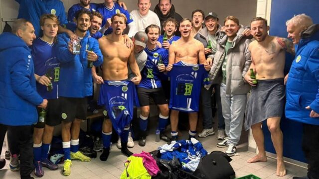 Foto: De overwinning wordt nog eens gevierd in de kleedkamer na de wedstrijd. Foto aangeleverd door VEW.