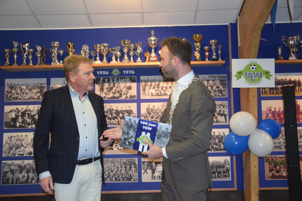 Oud en nieuw ontmoet elkaar deze avond, al vele generaties zijn lid (geweest) van VEW. (Groot)vader op zoon of dochter, maar niet alleen voetballend, ook in het bestuur, waaronder vele voorzitters, trainers en bovenal vrijwilligers in diverse hoedanigheden. “Zonder hen had VEW het geen 100 jaar volgehouden”, aldus voorzitter Ronald. De voorzitter vervolgt dat het goed gaat met de club met een jeugdafdeling van 170 leden en vijf seniorenteams. Ook een nieuw eerste elftal, weliswaar deels door het omvallen van HFC Heemstede. Nu uitkomend in de vijfde klasse op zaterdag en dit seizoen gelijk al de eerste periodekampioenschap te pakken. Ronald is ook trots op de afkomst van de club. Gestart als zaterdagvereniging en is dat nog steeds. Een club met geborgenheid, familiair, gezellig en sociaal. ‘VEW is een club met een fatsoenlijke mentaliteit’, staat in het jubileumboek beschreven. Met het heffen van het glas wordt er geproost op 100 jaar VEW.