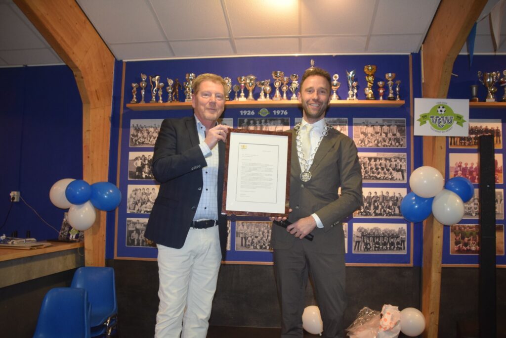 Foto boven: Namens de KNVB bood Frank Pauw (links) een KNVB vaandel 100 met daarop 100 jaar VEW.
