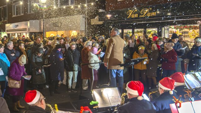 Heemstede –  Onder leiding van de enthousiaste dirigent Miklós Fürst verzorgde de Teisterband woensdagavond  24 december weer de traditionele kerstsamenzang op het pleintje in de Raadhuisstraat ter hoogte van Chocolaterie Van Dam. De sfeervolle kerstsamenzang werd, ondanks de ijzige vrieskou, net als andere jaren weer druk bezocht door belangstellenden uit Heemstede en omgeving.  Rond 22:00 uur stroomde het feestelijk verlichte pleintje bij de dorpspomp vol met bezoekers, die zich goed hadden voorbereid op de snijdende kou met sjaals, (kerst)mutsen en handschoenen.  De warme Glühwein, aangeboden door de gemeente Heemstede en de heerlijke, eigengemaakte warme chocolademelk, aangeboden door Chocolaterie Van Dam waren in deze kou ook van harte welkom.