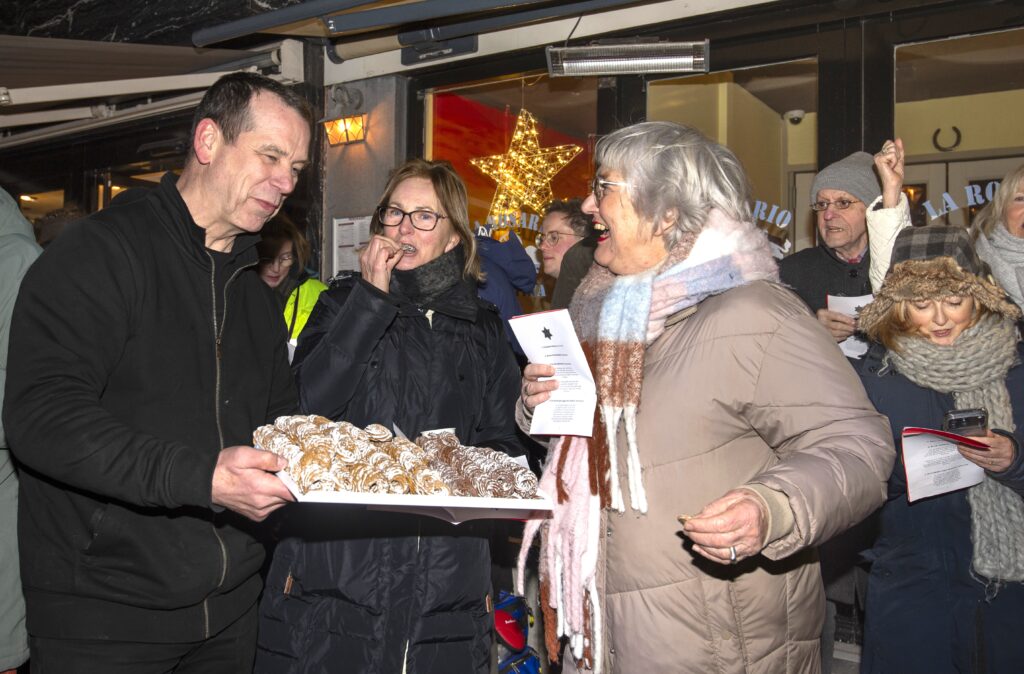 Voordat de samenzang begon werden boekjes met de tekst van de (kerst)liedjes uitgedeeld , zodat iedereen uit volle borst mee kon zingen.  Na een welkomstwoord van Miklós Fürst namens Chocolaterie van Dam en de Teisterband, werd de samenzang swingend geopend met de Christmas Swing. Willem van Dam ging spontaan rond met een schaal heerlijke chocoladekransjes en het publiek zong enthousiast mee met traditionele, klassieke kerstliedjes. Onder andere Winter Wonderland, Rudolph the Rednosed Reindeer, Mary’s Boy Child, Jingle Bells, Komt allen tezamen, Gloria in Excelsis Deo en Stille nacht, Heilige nacht kwamen voorbij.  Maar ook andere (kerst)liedjes zoals Last Christmas, God only knows, What a Wonderful World en All I want for Christmas is You kwamen aan bod. Toen de Teisterband het bekende ‘ It’s beginning to look a lot like Christmas’ inzette, begon het tot ieders verrassing zelfs even zachtjes te sneeuwen. Na een uurtje werd de samenzang swingend afgesloten met het vrolijke Feliz Navidad.  Na een daverend applaus bedankte Miklós Fürst  het publiek voor hun komst en het enthousiaste meezingen: “Een fijne kerst en tot volgend jaar.”